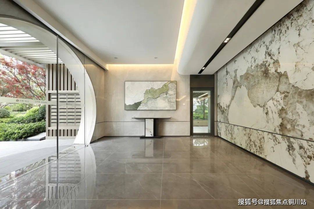 别出心裁的双精装入户大堂:一楼的入户单元门采用了月洞门的造型,结合地面上的拼花,在视觉上刚好凑成一轮圆月,圆圆满满!单元大堂内部空间采用仿古瓷砖搭配古铜色金属,低调奢雅。