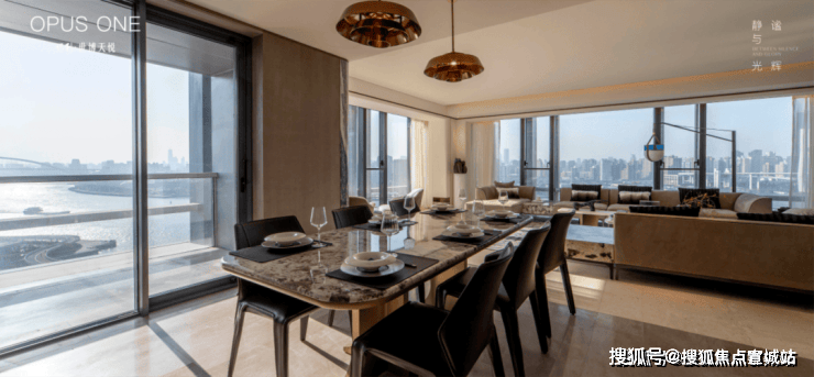 这客厅既是270°全景舱厅,无论全家在餐桌前欢聚一堂,还是孩子们在客厅嬉戏,一抬头便是以江景和城市为主题的巨幅油画。
