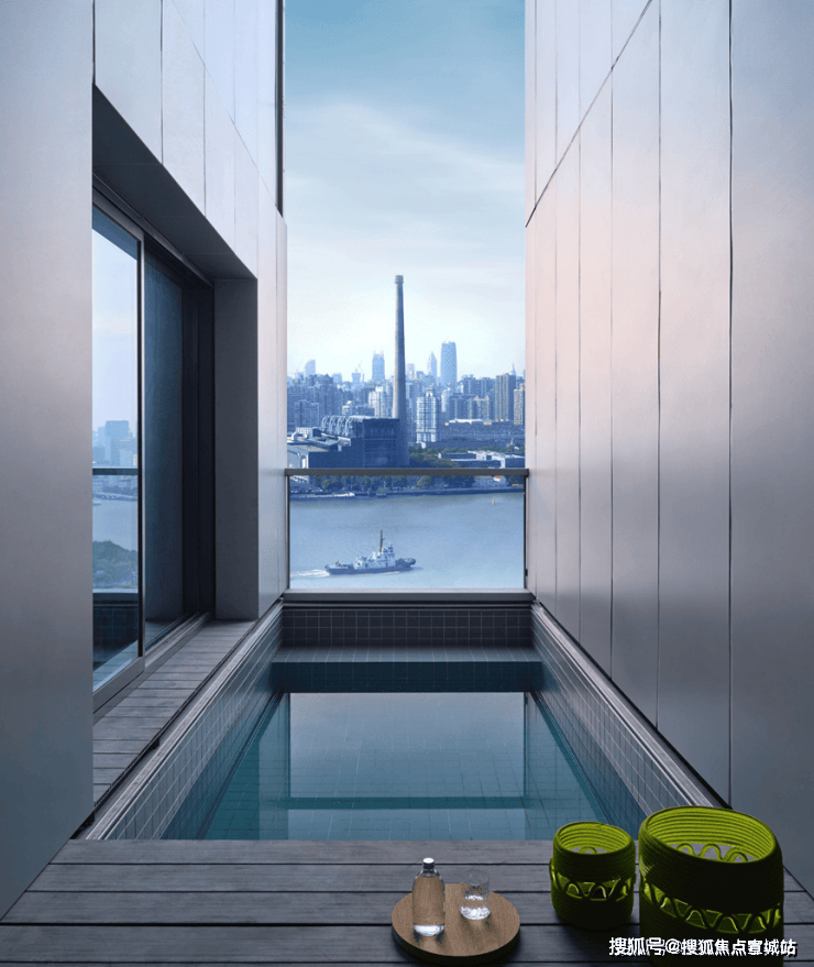 约252㎡中间套则在13.2米瞰江面基础上,奇数层开创性地增加了约6米的进深采光面,利用中间套的双层挑高,打造上海滨江首个空中泳池户型。
